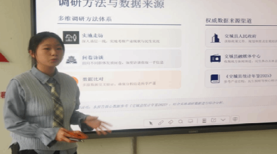 在学研思行统一度方面,选手们紧扣主题,深入分析调研与实践的关联,用真实数据与客观案例提炼问题,提出贴合实际的发展建议,充分展现了扎实的调研功底与深刻的乡土思考;在语言表达上,表达流畅自然、节奏把握得当。同时,选手们的演示文稿排版美观简洁、图文并茂,与演讲内容高度匹配,有效辅助了成果呈现;在现场表现中,大家精神饱满、仪态大方,从容应对突发情况,全力把握五分钟的演讲,展现了良好的心理素质与应变能力。