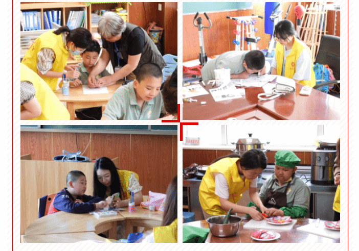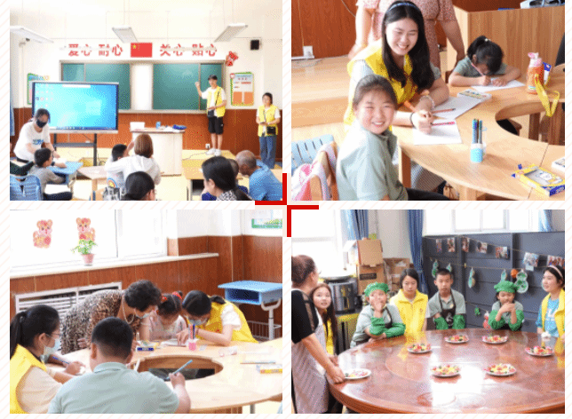 志愿者们经过前期充分准备,有的和孩子一起画简笔画,有的一起做手工,有的一起做水果拼盘,还有的一起唱歌跳舞。特教学校的孩子们从开始的好奇、胆怯,到后来和志愿者哥哥姐姐打成一片,整个活动过程热烈而温馨。